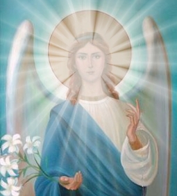 Gavriil, cerescul sol, aducând un crin în dar, Îţi grăieşte: Precurată, plină eşti de sfântul har. Tu între femei Marie binecuvântată eşti, Venerată şi de oameni, şi de oştile cereşti !